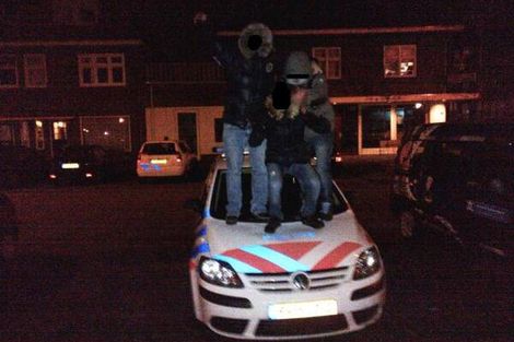 Aangezien het tonen van fotos en videobeelden van jong straattuig en buitenlanders vaak veel succes heeft, hierbij wederom een foto van drie jonge snotapen die het blijkbaar stoer vinden om bovenop een politiewagen te staan.